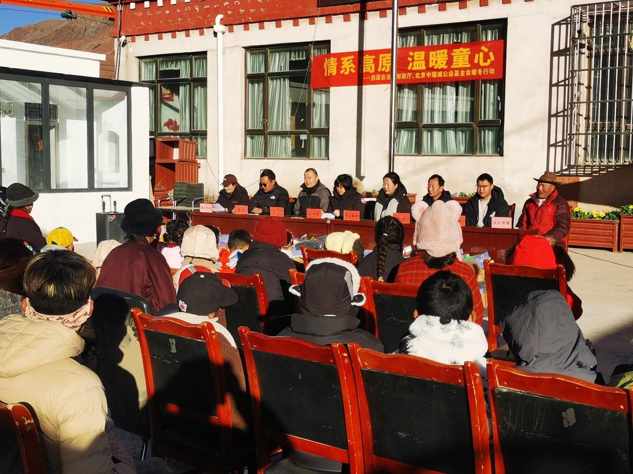 西藏自治区财政厅会计处四级调研员央金措姆,那曲市财政局四级调研员洛桑,北京中瑞诚公益基金会副秘书长史秋晨等共同出席活动,向学生代表发放暖冬物资。