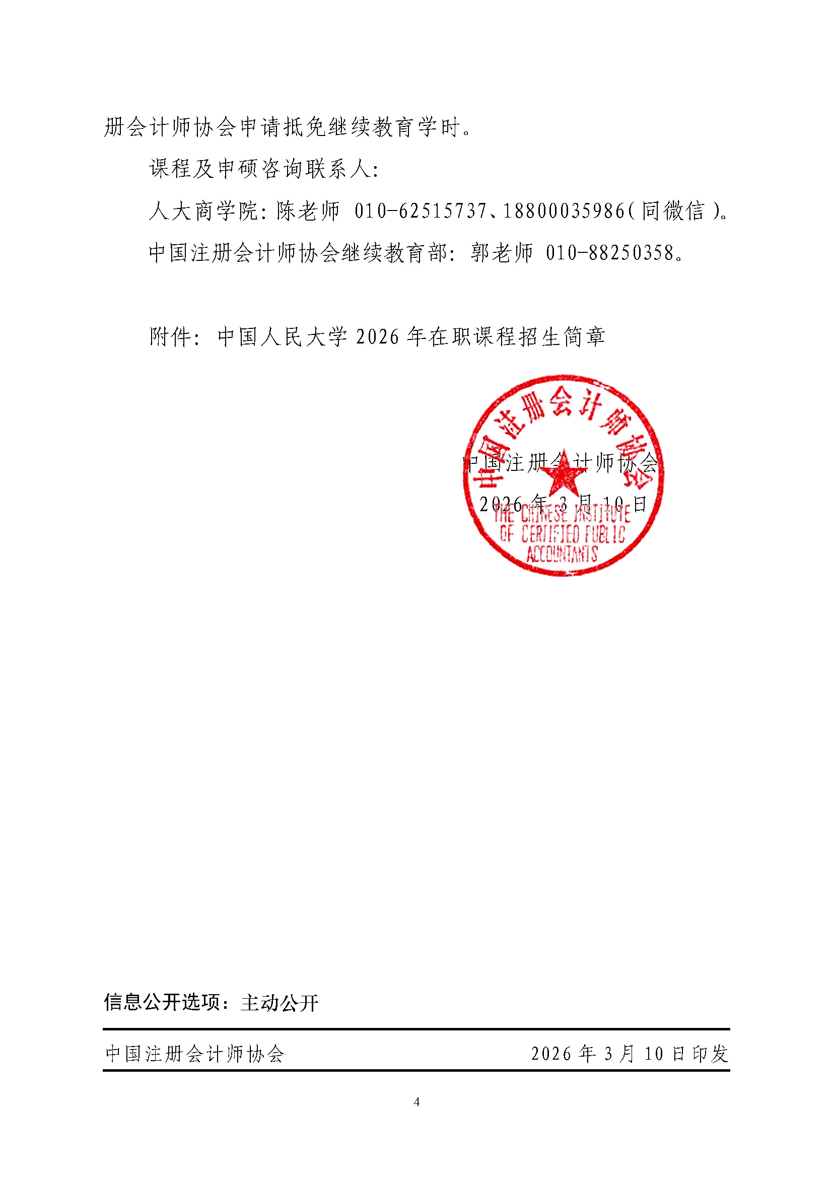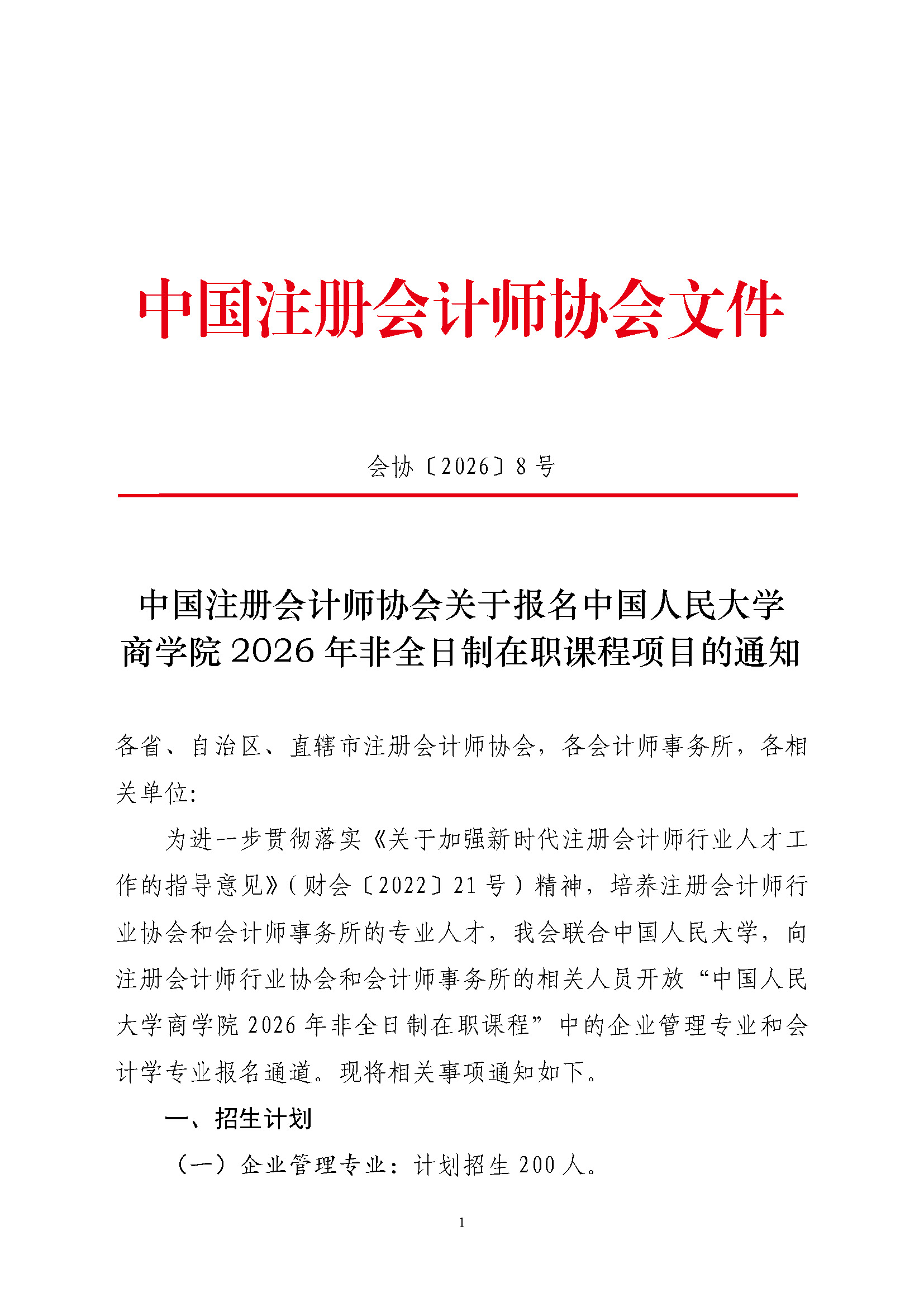 中国注册会计师协会关于报名中国人民大学商学院2026年非全日制在职课程项目的通知